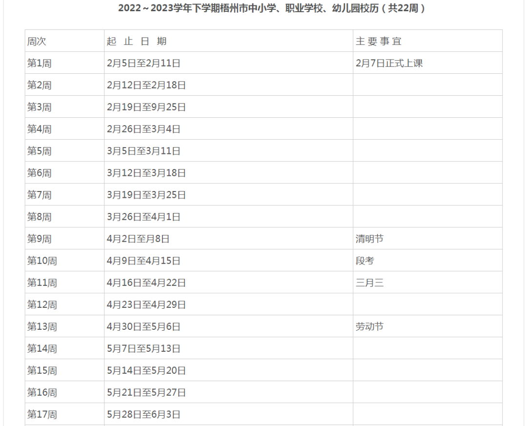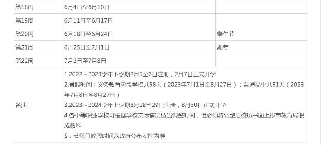 校歷顯示,2022-203學(xué)年春季學(xué)期共22周,第21周期考,2023年7月1日起放暑假。