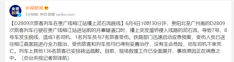據(jù)央視新聞消息:6月4日10時(shí)30分許,貴陽(yáng)北至廣州南的D2809次旅客列車行駛在貴廣線榕江站進(jìn)站前的月寨隧道口時(shí),撞上突發(fā)溜坍侵入線路的泥石流,導(dǎo)致7號(hào)、8號(hào)車發(fā)生脫線,造成1名司機(jī)、1名列車員與7名旅客受傷。