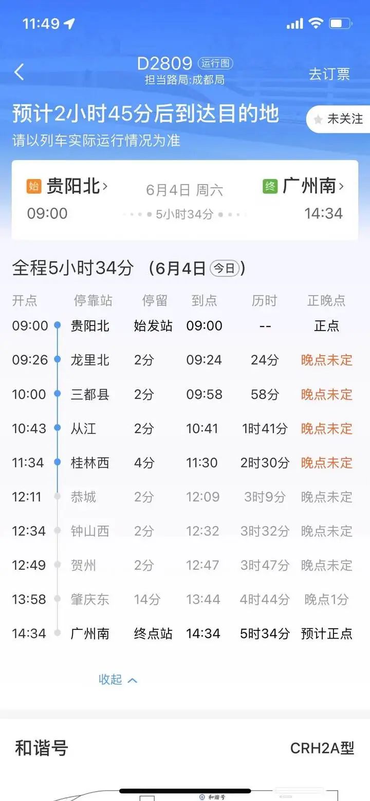 列車早上9點(diǎn)從貴陽(yáng)北站出發(fā),途經(jīng)從江、桂林西和賀州等站點(diǎn),原計(jì)劃于下午2點(diǎn)34分到達(dá)廣州南站。受事故影響,貴陽(yáng)北站開(kāi)往廣州的動(dòng)車全部停運(yùn),廣州至貴陽(yáng)方向的動(dòng)車全部??客睃c(diǎn)。
