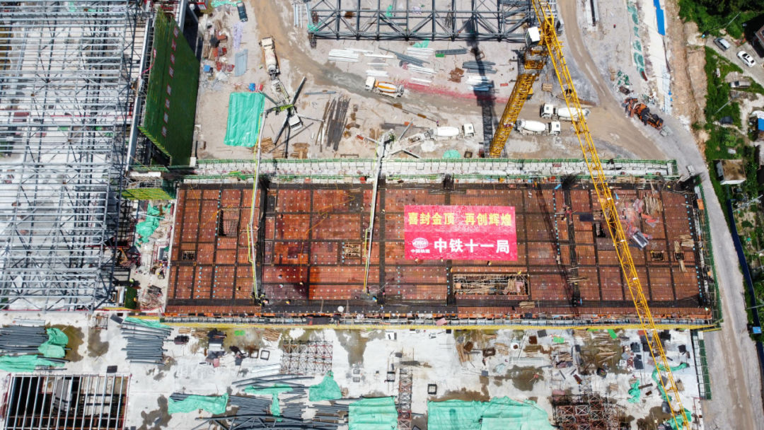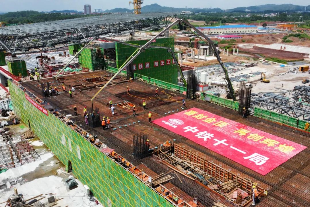 遠(yuǎn)遠(yuǎn)看過去,造型酷似鳳凰展翅的玉林北站兩翼的翅尖已經(jīng)展露出來了!6月27日10時(shí)許,玉林北站高架站房最后一板混凝土開始澆筑,當(dāng)天順利完成。