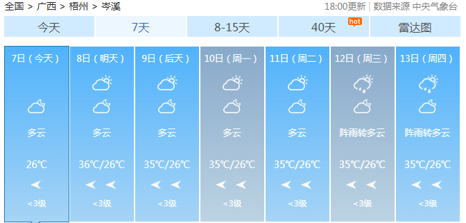 12~14日,多云,有陣雨或雷雨、局部大雨,偏東風1-2級。最高氣溫:35~36℃。