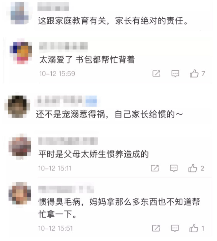從截圖中,我們能夠看出來這位媽媽把大包小包都放在了自己身上,可見對孩子的包容程度。