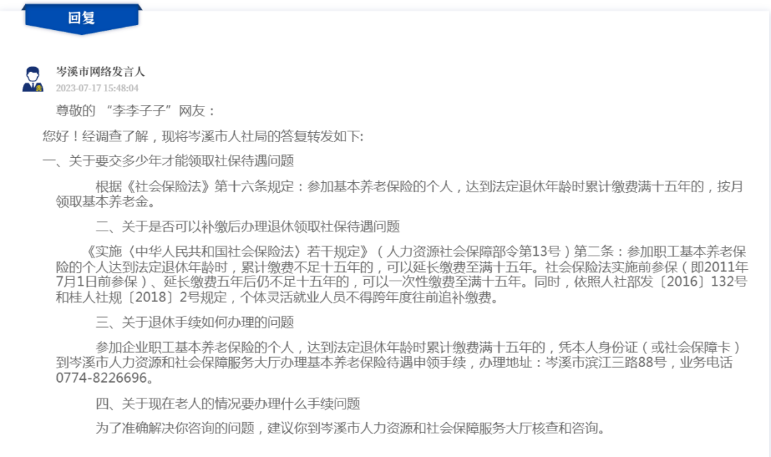岑溪市人社局給出了相對(duì)應(yīng)的答復(fù):領(lǐng)取基本養(yǎng)老金需達(dá)到法定退休年齡且社保累計(jì)繳費(fèi)滿十五年,年限不足的可延長繳費(fèi)至滿十五年。