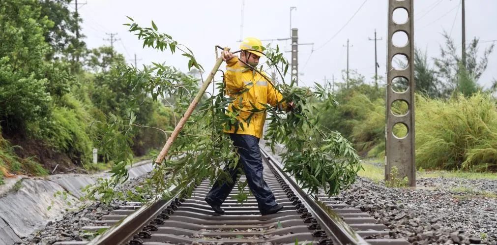 國鐵南寧局沿海鐵路公司職工在清理軌道上的樹枝。新華社記者 張愛林 攝