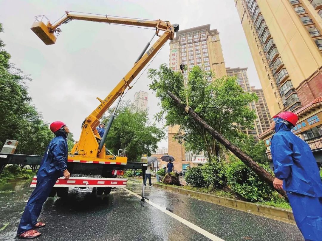 7月18日,北海市市政部門工作人員正在處置被臺風吹倒的樹木。