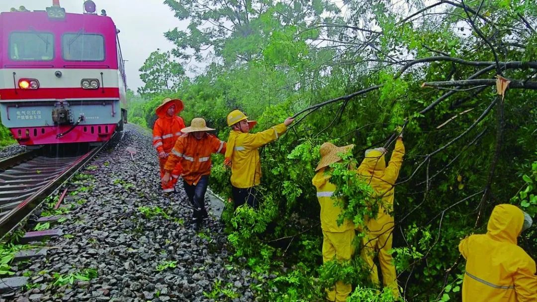 國鐵南寧局沿海鐵路公司職工在風雨中清理倒伏樹木。新華社記者 張愛林 攝