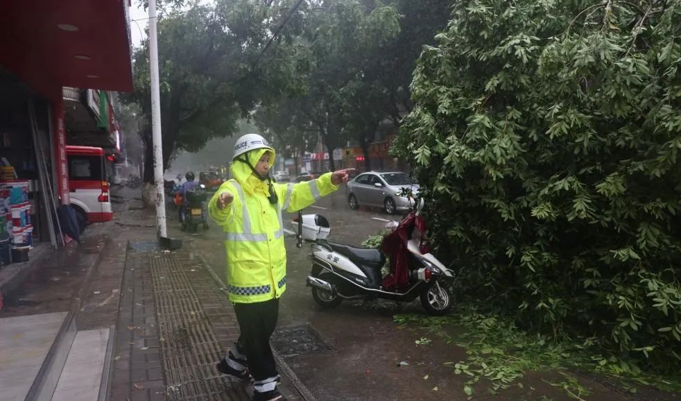 一名交警在被“泰利”臺風吹倒的樹邊指揮交通。新華社記者 胡星宇 攝
