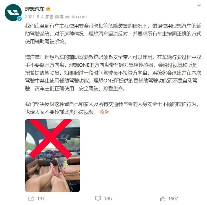 針對(duì)上述行為,理想汽車在2021年曾通過微博回應(yīng)稱,“理想汽車的輔助駕駛系統(tǒng)必須系安全帶才可以使用。在車輛行駛過程中雙手不要離開方向盤,理想ONE的方向盤帶有握力感應(yīng)傳感器,會(huì)通過視覺和聽覺報(bào)警提醒駕駛員,如果超過一段時(shí)間駕駛員不接管方向盤,系統(tǒng)將會(huì)退出并在本次駕駛中禁止使用輔助駕駛功能。”