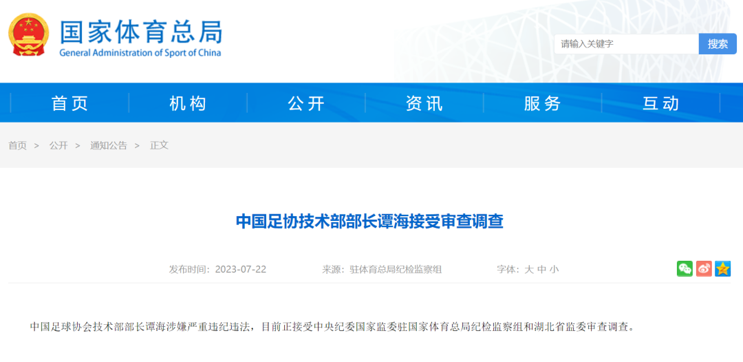 中國(guó)足球協(xié)會(huì)技術(shù)部部長(zhǎng)譚海涉嫌嚴(yán)重違紀(jì)違法,目前正接受中央紀(jì)委國(guó)家監(jiān)委駐國(guó)家體育總局紀(jì)檢監(jiān)察組和湖北省監(jiān)委審查調(diào)查。