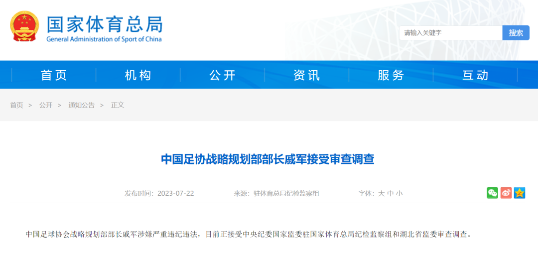 中國(guó)足球協(xié)會(huì)戰(zhàn)略規(guī)劃部部長(zhǎng)戚軍涉嫌嚴(yán)重違紀(jì)違法,目前正接受中央紀(jì)委國(guó)家監(jiān)委駐國(guó)家體育總局紀(jì)檢監(jiān)察組和湖北省監(jiān)委審查調(diào)查。