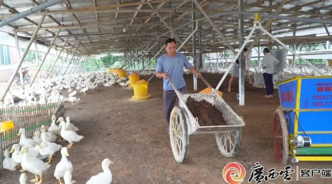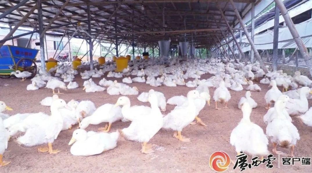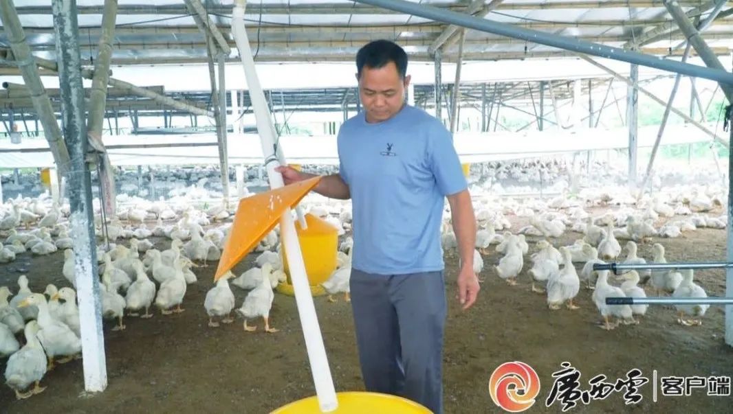 謝慶忠是大業(yè)鎮(zhèn)泗龍村的脫貧戶。2021年春,在廣州務(wù)工的謝慶忠因家中母親年老需要照顧,只好辭職回村,并經(jīng)選舉擔(dān)任泗龍村黨委委員等職務(wù)。經(jīng)過詳實(shí)的市場(chǎng)考察,他十分看好養(yǎng)鴨產(chǎn)業(yè)的發(fā)展前景,于是在2022年3月底籌資30多萬(wàn)元建成了一個(gè)面積約1800平方米的養(yǎng)鴨場(chǎng),并以“公司+農(nóng)戶”的模式與廣西實(shí)隆農(nóng)牧集團(tuán)有限公司簽訂合作養(yǎng)殖合同,由公司提供鴨苗、飼料、防疫藥劑和管理技術(shù)指導(dǎo)、保價(jià)回收等服務(wù),開始了每批飼養(yǎng)五六千羽鴨子的現(xiàn)代化、自動(dòng)化、規(guī)模化的養(yǎng)鴨之路。