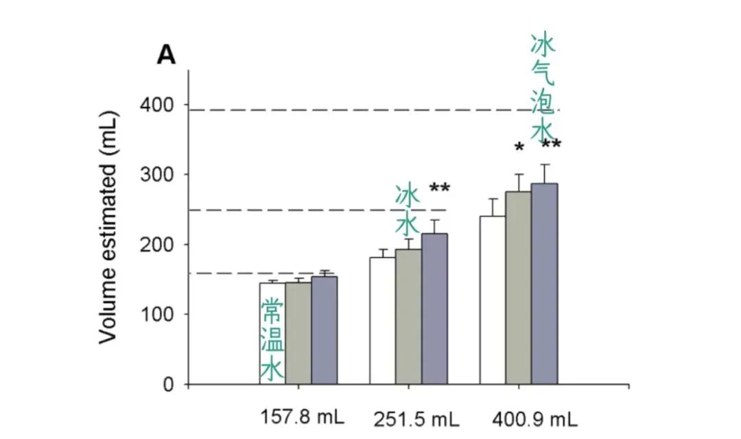 結(jié)果顯示,先喝冰氣泡水的人后續(xù)喝的常溫水最少,其次是冰水,最后是常溫水。這表明冰氣泡水對緩解口渴的效果最好,其次是冰水,常溫水最差。