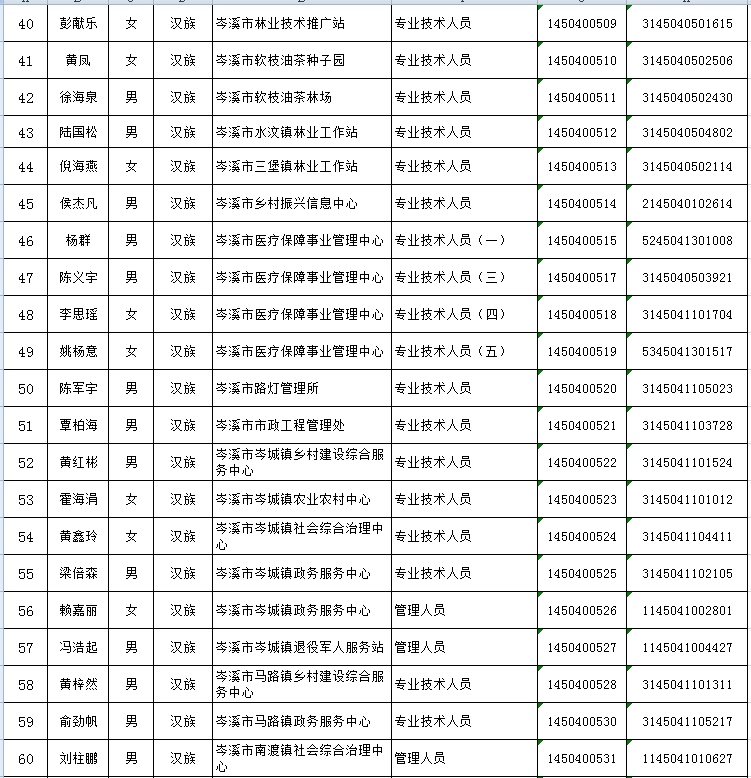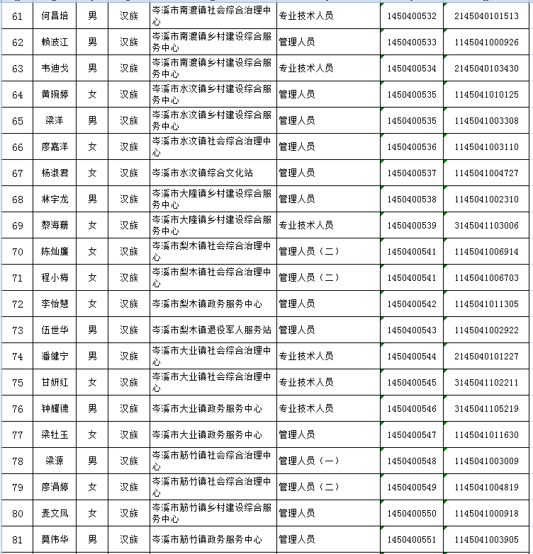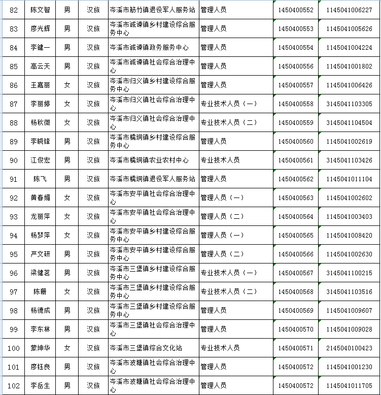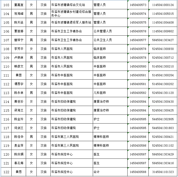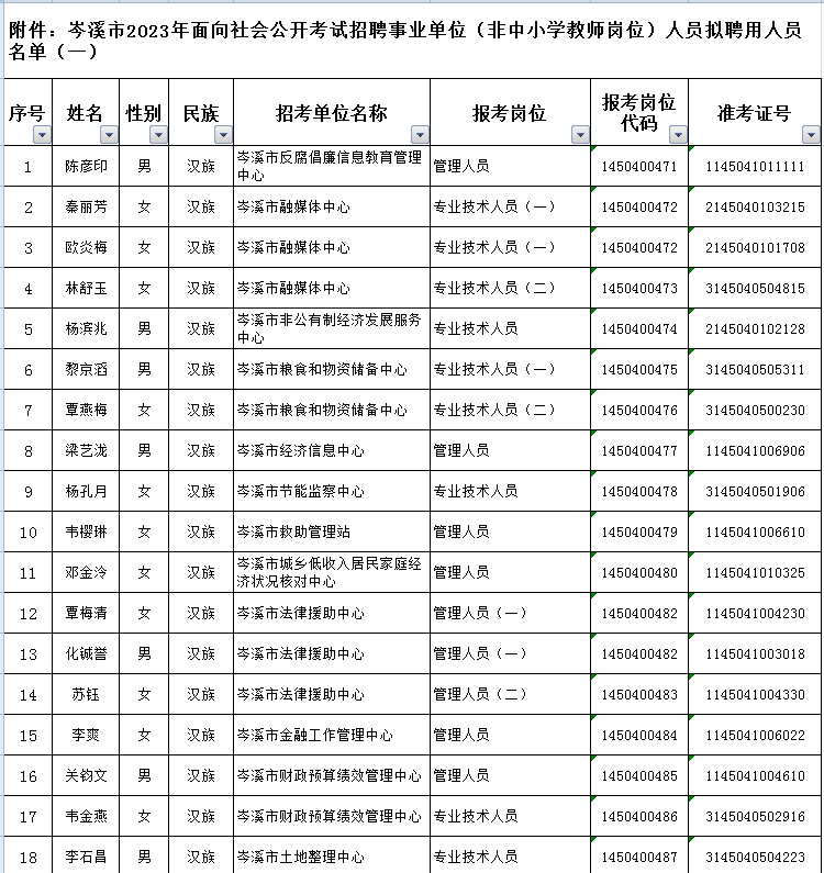根據(jù)《梧州市2023年面向社會(huì)公開(kāi)考試招聘事業(yè)單位(非中小學(xué)教師崗位)人員簡(jiǎn)章》的要求,經(jīng)過(guò)筆試、面試、考核、體檢等程序,確定陳彥印等122名同志為擬聘用岑溪市事業(yè)單位人員,現(xiàn)予以公示,公示期為2023年7月27日至8月2日。如對(duì)擬聘用人員的聘用資格有異議,請(qǐng)以書面形式,并署真實(shí)姓名和聯(lián)系地址,于8月2日前郵寄或直接送岑溪市人社局(直接送的以送達(dá)日期為準(zhǔn);郵寄的以郵戳為準(zhǔn))。地址:岑溪市廣南路85號(hào),郵政編碼:543200;聯(lián)系電話:0774—8235223 8222803)。