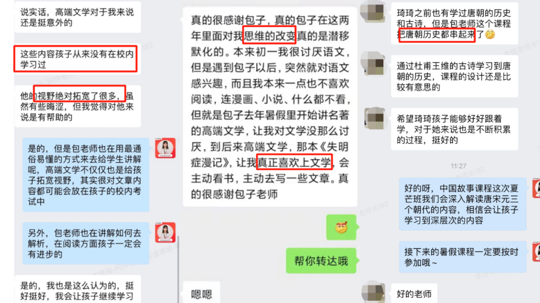 后面陸續(xù)收到了很多上過課的家長和孩子們的好評反饋,說孩子的語文閱讀、寫作真的得到了提高,在語文成績上也有提升。