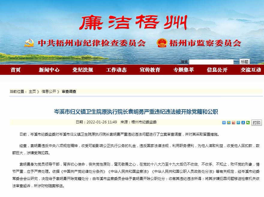 2022年1月26日,梧州市紀委監(jiān)委通報,岑溪市紀委監(jiān)委對岑溪市歸義鎮(zhèn)衛(wèi)生院原執(zhí)行院長袁明勇嚴重違紀違法問題進行了立案審查調(diào)查,并對其采取留置措施。經(jīng)岑溪市紀委常委會會議研究,決定給予袁明勇開除黨籍處分;由岑溪市監(jiān)察委員會給予袁明勇開除公職處分;收繳其違紀違法所得;將其涉嫌犯罪問題移送檢察機關(guān)依法審查起訴,所涉財物隨案移送。近年來,在醫(yī)藥反腐力度持續(xù)加大背景下,醫(yī)院院長、書記成為被“盯緊”的對象,特別是今年開年以來,反腐風(fēng)暴越刮越勁。