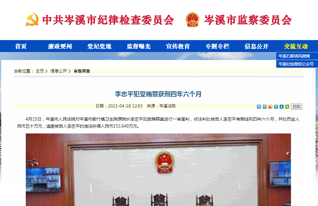 2022年4月15日,岑溪市人民法院對岑溪市筋竹鎮(zhèn)衛(wèi)生院原院長李忠平犯受賄罪案進行一審宣判,依法判處被告人李忠平有期徒刑四年六個月,并處罰金人民幣五十萬元,追繳被告人李忠平的違法所得人民幣153.649萬元。