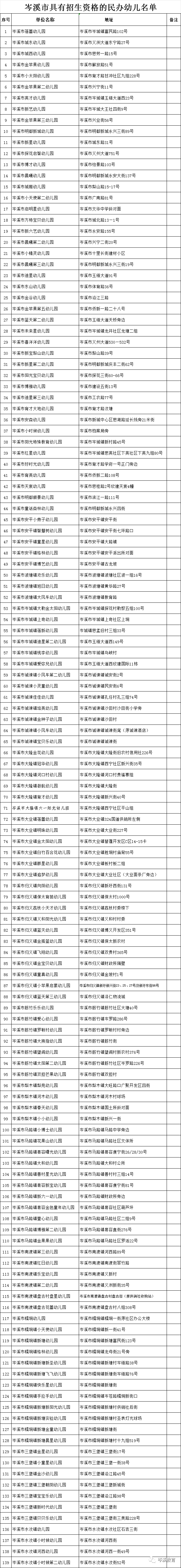 【岑溪教育8月23日】為進(jìn)一步規(guī)范民辦幼兒園辦園行為,促進(jìn)全市學(xué)前教育健康發(fā)展,進(jìn)一步完善社會(huì)監(jiān)督機(jī)制,方便群眾,優(yōu)化服務(wù),向社會(huì)準(zhǔn)確提供信息,以保護(hù)廣大家長(zhǎng)的利益,現(xiàn)將2023年秋季具有招生資格民辦幼兒園公布如下(見(jiàn)附表,共139家)。
