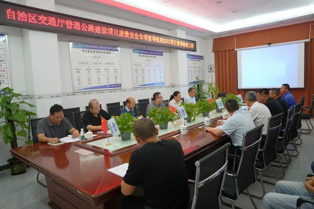 ▲督導組聽取S201線蒼梧京南至梧州人和港公路項目施工單位匯報施工情況