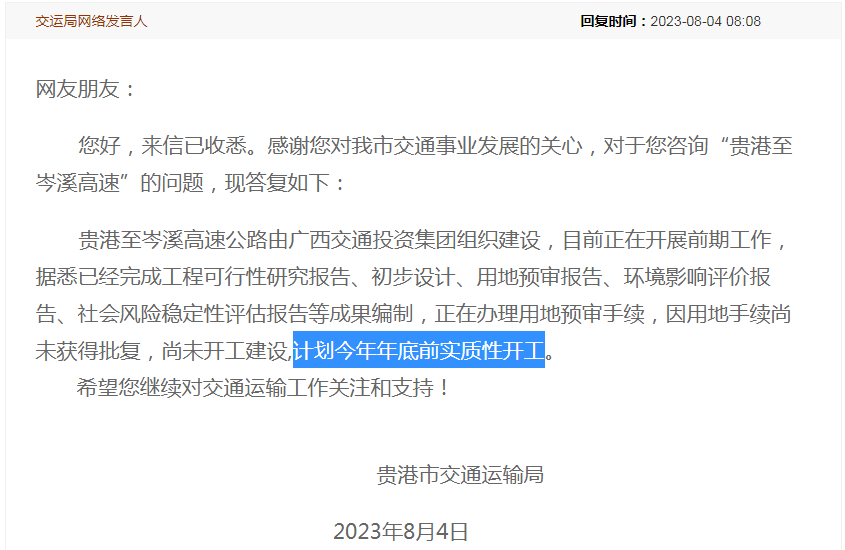 8月4日 ,據(jù)貴港市交通運(yùn)輸局答復(fù)表示,目前正在進(jìn)行用地審批,預(yù)計(jì)年底前實(shí)質(zhì)性開(kāi)工。