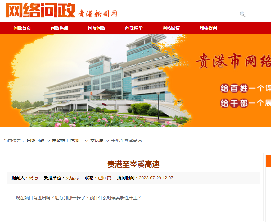 今年7月份,有網(wǎng)友在貴港新聞網(wǎng)網(wǎng)絡(luò)問(wèn)政平臺(tái)提到貴港至岑溪高速公路項(xiàng)目進(jìn)展問(wèn)題,并問(wèn)及計(jì)劃什么時(shí)候開(kāi)工建設(shè)?
