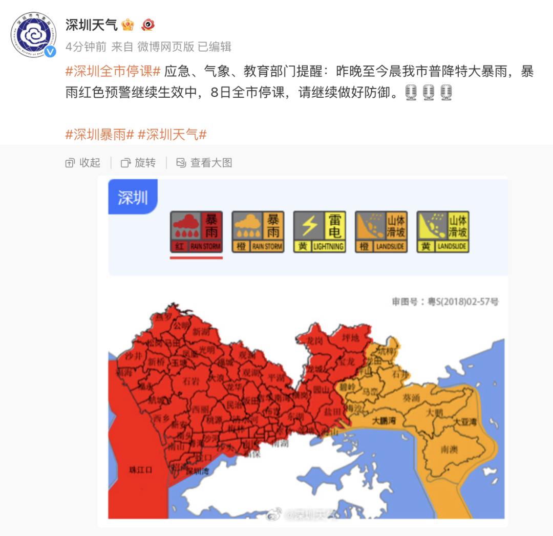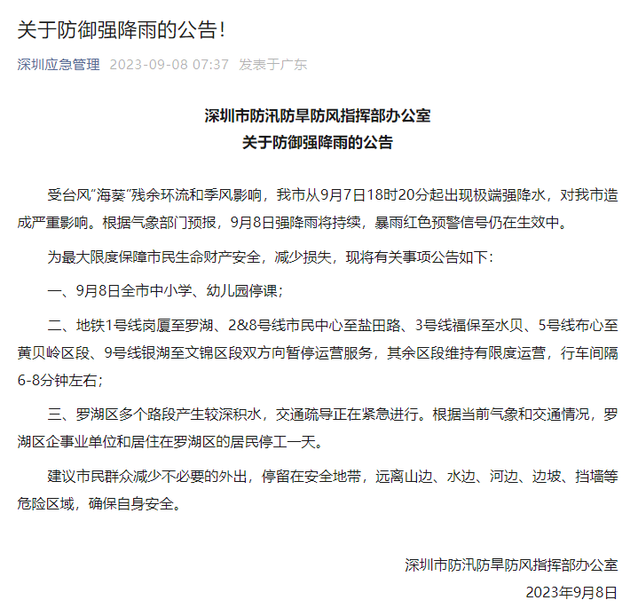 8日,深圳市防汛防旱防風指揮部辦公室發(fā)布關(guān)于防御強降雨的公告:
