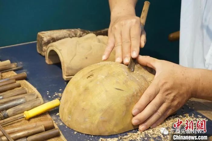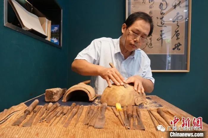 圖為桂北儺面具制作技藝代表性傳承人唐江峰在雕刻儺面具。歐惠蘭 攝