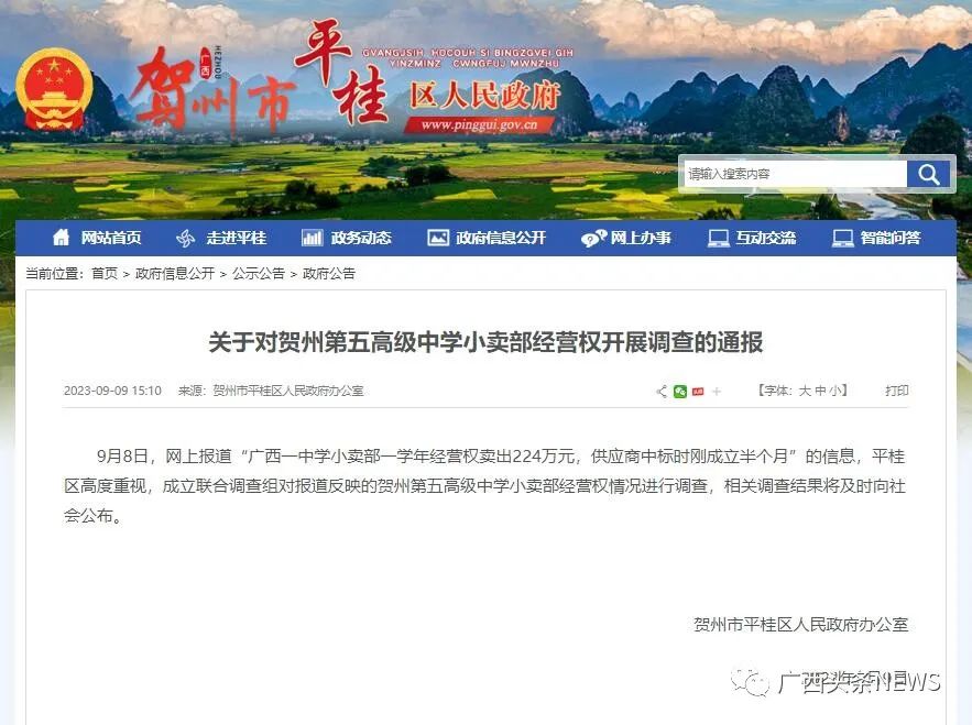 9月9日,賀州市平桂區(qū)人民政府辦公室在政府官網(wǎng)發(fā)布通報,對網(wǎng)上報道的有關(guān)“中學(xué)小賣部一年經(jīng)營權(quán)賣出224萬元”一事成立聯(lián)合調(diào)查組進(jìn)行調(diào)查。【詳情】