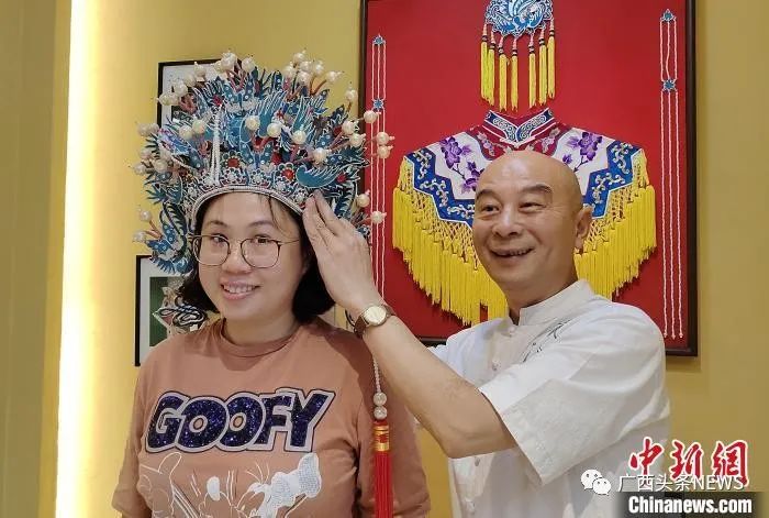 圖為南寧游客盧敏(左)在桂林秀峰非遺傳承體驗(yàn)·桂林喜來登站里試戴桂劇鳳冠。楊宗盛 攝