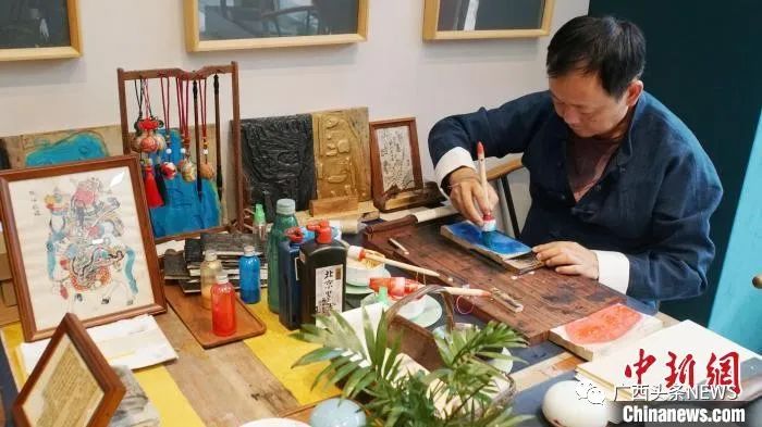 圖為桂林雕版彩色套印技藝代表性傳承人胡波在展示雕版彩色套印技藝。周利朔 攝