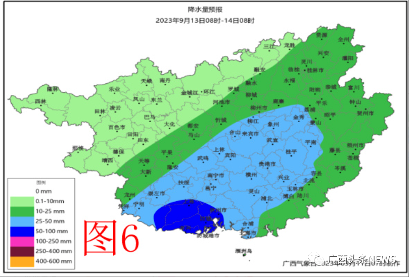 13日,防城港、欽州、北海、崇左、南寧、貴港、玉林、來賓等市有大雨、局地暴雨,其它地區(qū)有小到中雨、局地大雨(附圖6)
