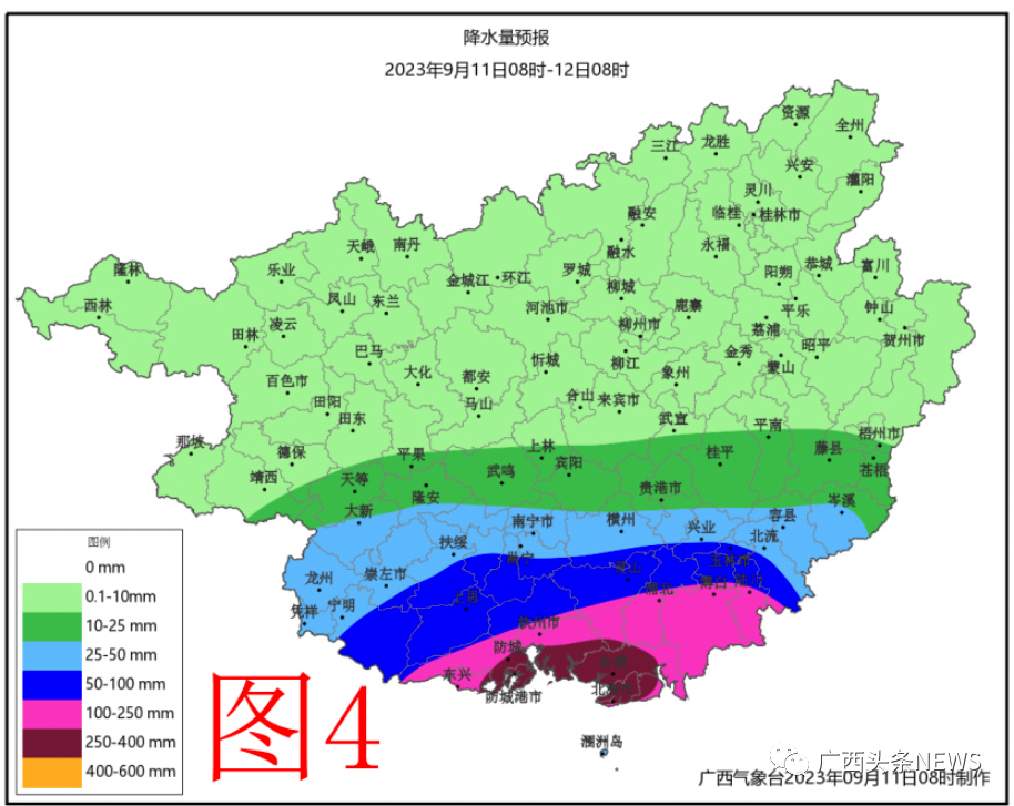 11日(今天)白天到晚上,玉林、北海、欽州、防城港等市和南寧、崇左兩市南部有暴雨到大暴雨、局地特大暴雨,最大可能出現(xiàn)大暴雨以上的縣(市、區(qū))有:玉林的市區(qū)、博白、陸川、北流,北海全市,欽州全市,防城港的市區(qū)、東興;上述縣(市、區(qū))降雨量100~180毫米、局地300毫米以上,最大小時降雨量為40~60毫米、局地80毫米以上;其它地區(qū)小到中雨、局地大雨到暴雨(附圖4)。