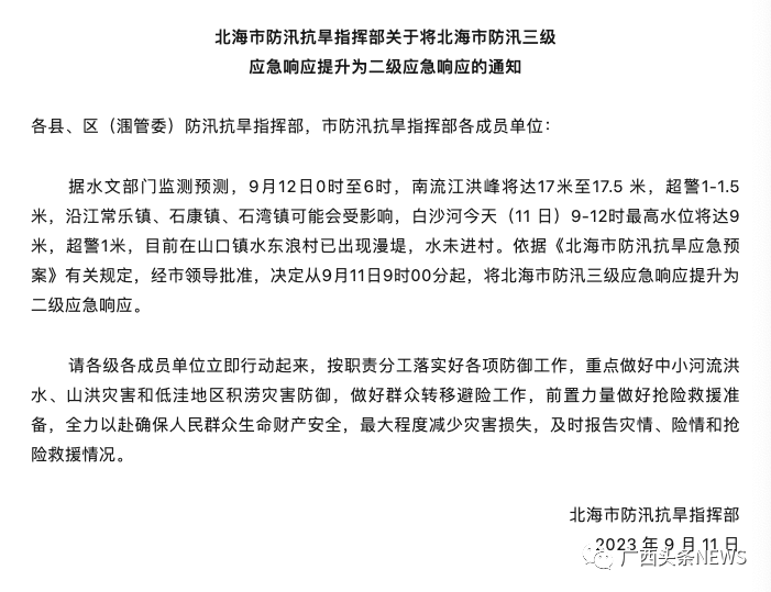 北海市防汛抗旱指揮部也發(fā)布通知,將北海市防汛三級應(yīng)急響應(yīng)提升為二級應(yīng)急響應(yīng)。