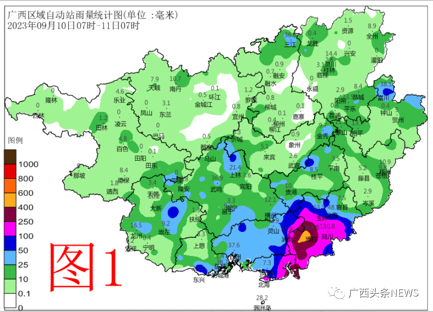 廣西氣象部門介紹,受“??睔垳u和季風(fēng)影響,9月10日到11日,玉林、北海、欽州等地出現(xiàn)特大暴雨。據(jù)統(tǒng)計(jì),9月10日07時-11日07時,超過400毫米有玉林市博白縣的4個鄉(xiāng)鎮(zhèn)(水鳴鎮(zhèn)446.2毫米、亞山鎮(zhèn)439毫米、沙河鎮(zhèn)410.4毫米、頓谷鎮(zhèn)404.2毫米),250~400毫米有3個市的5個縣(市、區(qū))的18個鄉(xiāng)鎮(zhèn),100~250毫米有3個市的11個縣(市、區(qū))的47個鄉(xiāng)鎮(zhèn),50~100毫米有8個市的20個縣(市、區(qū))的56個鄉(xiāng)鎮(zhèn)(附圖1),其中博白本站368.8毫米突破歷史極值(311.7毫米)。