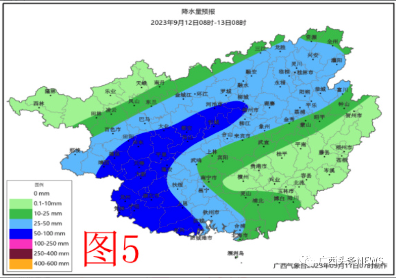 12日,防城港、欽州、北海、崇左、南寧、河池、柳州、來賓、桂林等市和百色南部有大雨到暴雨、局地大暴雨,并伴有短時雷暴大風(fēng)等強(qiáng)對流天氣,最大可能出現(xiàn)暴雨以上的縣(市、區(qū))有:崇左全市,百色的德保、靖西、那坡、田陽、平果,南寧的隆安,河池的都安、大化;上述縣(市、區(qū))降雨量50~80毫米、局地120毫米以上,最大小時降雨量為30~40毫米、局地60毫米以上;其它地區(qū)小到中雨、局地大雨到暴雨(附圖5)
