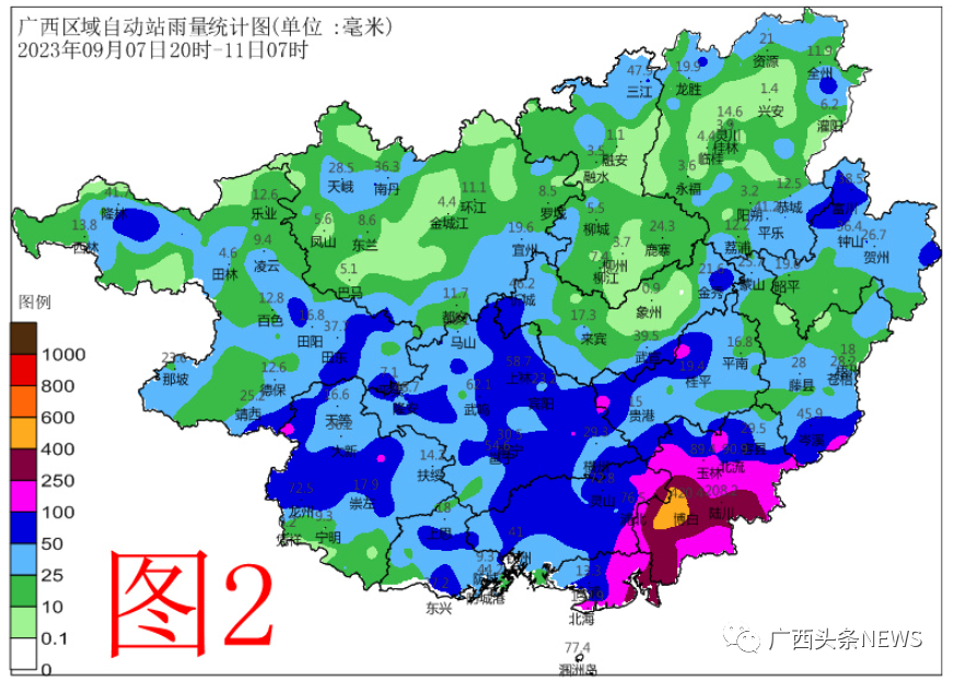 在此過程(9月7日20時-11日07時),玉林市博白、福綿2個縣(區(qū))的8個鄉(xiāng)鎮(zhèn)超過400毫米,最大為博白水鳴488.7毫米,250~400毫米有3個市的7個縣(市、區(qū))的24個鄉(xiāng)鎮(zhèn),100~250毫米有7個市的19個縣(市、區(qū))的71個鄉(xiāng)鎮(zhèn),50~100毫米有14個市的57個縣(市、區(qū))的203個鄉(xiāng)鎮(zhèn)(附圖2)。