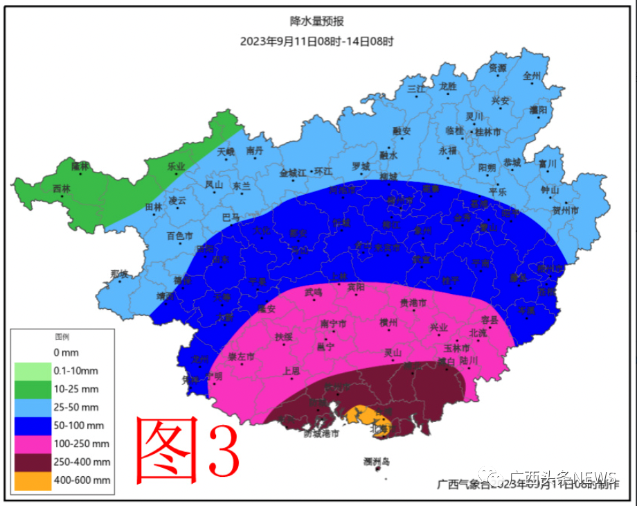 廣西氣象部門介紹,受“??睔垳u進(jìn)一步西移影響,11日至12日兩天桂南和沿海地區(qū)有暴雨到大暴雨、局地特大暴雨,11-13日累計(jì)雨量:桂南和沿海地區(qū)80~150毫米、局地400毫米以上,其它地區(qū)30~60毫米、局地100毫米以上(附圖3),最大小時降雨量40~60毫米、局地80毫米以上。