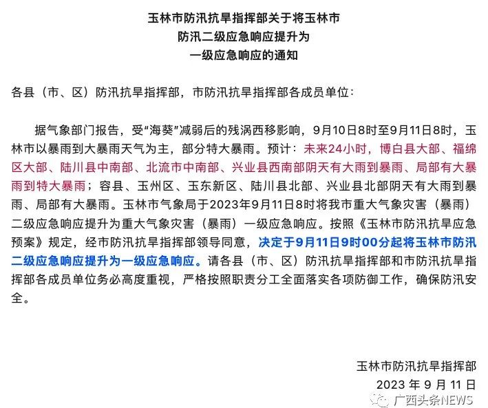 9月11日9時,玉林市防汛抗旱指揮部發(fā)布通知,將玉林市防汛二級應(yīng)急響應(yīng)提升為一級應(yīng)急響應(yīng)。對此,玉林市玉州區(qū)、博白縣、興業(yè)縣等多地學(xué)校停課一天。