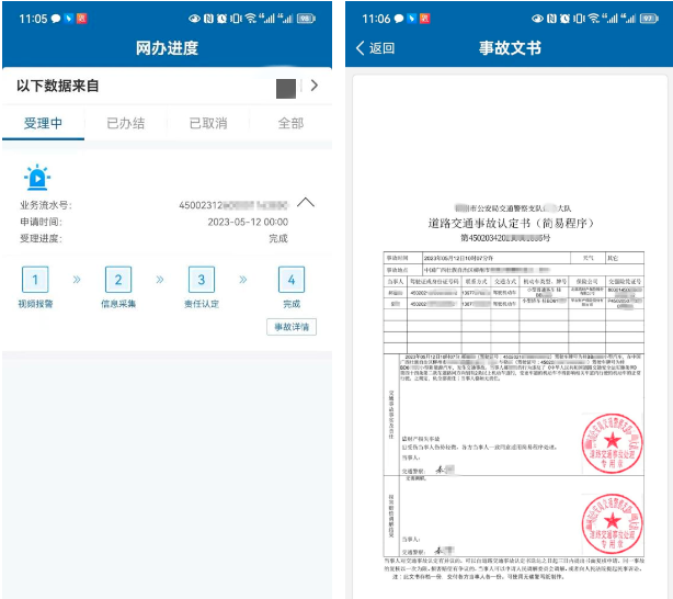 四是“事故認(rèn)定與文書查看”:事故現(xiàn)場撤除后,民警通過《公安交通管理綜合應(yīng)用平臺》查看事故事實,確認(rèn)當(dāng)事人的違法過錯行為,明確事故原因,確定事故責(zé)任,完成事故認(rèn)定。系統(tǒng)會自動向事故當(dāng)事人推送事故認(rèn)定相關(guān)信息。當(dāng)事人可以通過“交管12123”APP“網(wǎng)辦進(jìn)度”查看事故處理進(jìn)度;完成事故認(rèn)定的,當(dāng)事人可通過“交管12123”APP查看事故責(zé)任及電子文書。事故認(rèn)定書不需要當(dāng)事人簽字,對事故責(zé)任認(rèn)定有異議的,可在3個工作日內(nèi)提出書面復(fù)核申請。