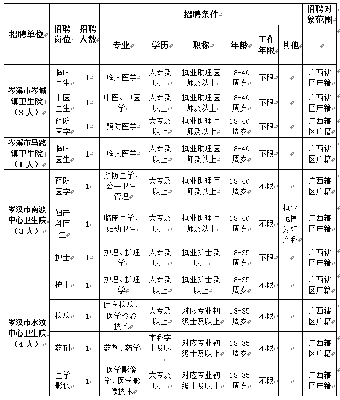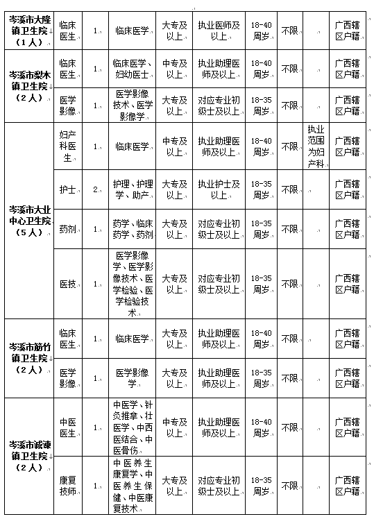 岑溪市各鎮(zhèn)衛(wèi)生院面向社會公開招聘專業(yè)技術(shù)人員共28名,具體招聘崗位、人數(shù)、資格條件等詳見《岑溪市2023年度面向社會公開招聘鄉(xiāng)鎮(zhèn)衛(wèi)生院專業(yè)技術(shù)人員計劃表》(附件1,以下簡稱《計劃表》)。
