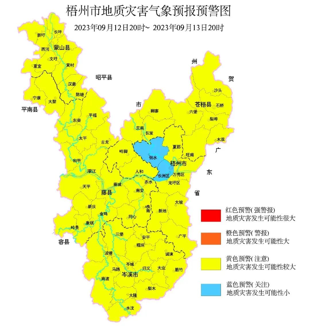 根據(jù)梧州市氣象臺未來24小時降雨預(yù)報及前期降雨實況,結(jié)合地質(zhì)環(huán)境條件分析,預(yù)計未來24小時內(nèi)藤縣、蒼梧縣、蒙山縣、岑溪市、龍圩區(qū)、萬秀區(qū)地質(zhì)災(zāi)害風(fēng)險預(yù)警等級為黃色預(yù)警(三級響應(yīng)),氣象因素等致地質(zhì)災(zāi)害發(fā)生風(fēng)險較高;長洲區(qū)地質(zhì)災(zāi)害氣象風(fēng)險預(yù)警等級為藍(lán)色預(yù)警(四級響應(yīng)),氣象因素等致地質(zhì)災(zāi)害發(fā)生有一定風(fēng)險,請做好地災(zāi)防范工作。