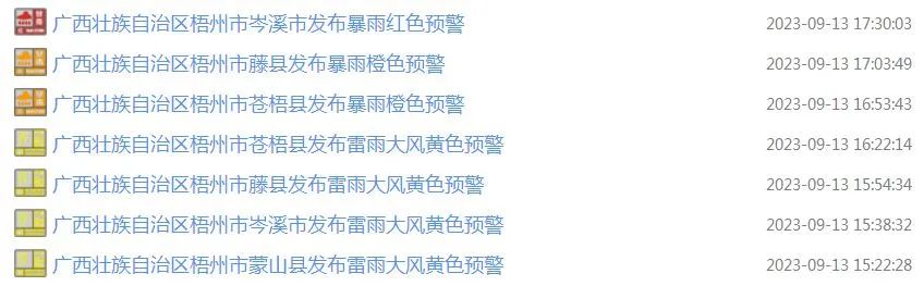 岑溪市氣象臺2023年9月13日17時(shí)30分將暴雨橙色預(yù)警信號提升為紅色:16時(shí)以來,岑溪市筋竹鎮(zhèn)出現(xiàn)50毫米以上強(qiáng)降雨,最大降雨量為筋竹78毫米,其次為筋竹義水58毫米;預(yù)計(jì)未來3小時(shí)我市三堡、波塘、誠諫、筋竹、岑城、水汶、大隆等鎮(zhèn)區(qū)將有30-50毫米,局部60毫米以上強(qiáng)降雨。