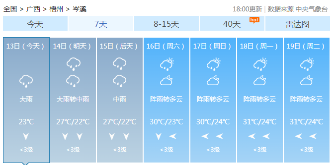 預(yù)計(jì)今晚到明天,全市有大雨到暴雨,局部大暴雨,并伴有短時(shí)雷暴大風(fēng)等強(qiáng)對流天氣。暴雨最大可能出現(xiàn)在蒼梧縣、藤縣所轄鄉(xiāng)鎮(zhèn),梧州市城區(qū),蒙山縣的夏宜、黃村、漢豪,岑溪市的三堡、安平、波塘、糯垌、筋竹、誠諫等鄉(xiāng)鎮(zhèn)。岑溪未來七天多雨天氣,最低氣溫22-24℃,最高氣溫27-31℃。