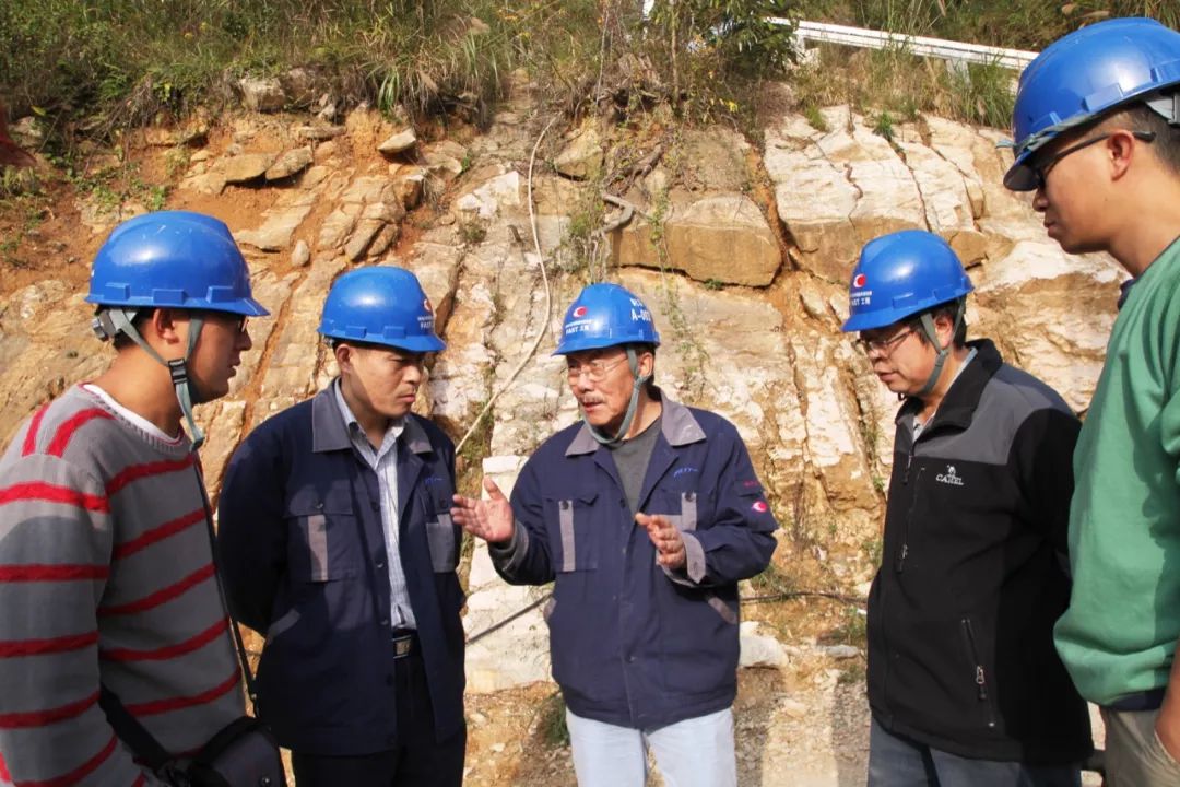 南仁東(左三)與工程技術(shù)人員在大窩凼施工現(xiàn)場檢查施工進(jìn)展。(2014年12月1日攝)。新華社發(fā)(中國科學(xué)院國家天文臺供圖)
