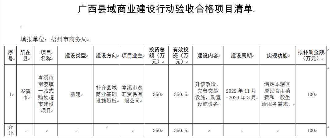 根據(jù)《關(guān)于印發(fā)〈廣西縣域商業(yè)建設(shè)行動試點縣及項目管理細(xì)則(試行)〉〈廣西縣域商業(yè)建設(shè)行動資金管理細(xì)則(試行)〉的通知》(桂商建發(fā)〔2022〕48號)的相關(guān)要求,我局聯(lián)合市財政局、市鄉(xiāng)村振興局,對2022年廣西縣域商業(yè)建設(shè)行動試點縣中已建成并投入運行的“岑溪市南渡鎮(zhèn)一站式購物超市建設(shè)項目”進(jìn)行了現(xiàn)場初步驗收,該項目建成并達(dá)到預(yù)期,同時符合相關(guān)要求?,F(xiàn)將初步驗收通過的岑溪市南渡鎮(zhèn)一站式購物超市建設(shè)項目予以公示(詳見附件1、2、3)。公示時間為2023年9月11日至2023年9月17日。如有異議,請于2023年9月17日下午6點前將有關(guān)材料反映至岑溪市工業(yè)和信息化局(商務(wù)局)商貿(mào)服務(wù)股。