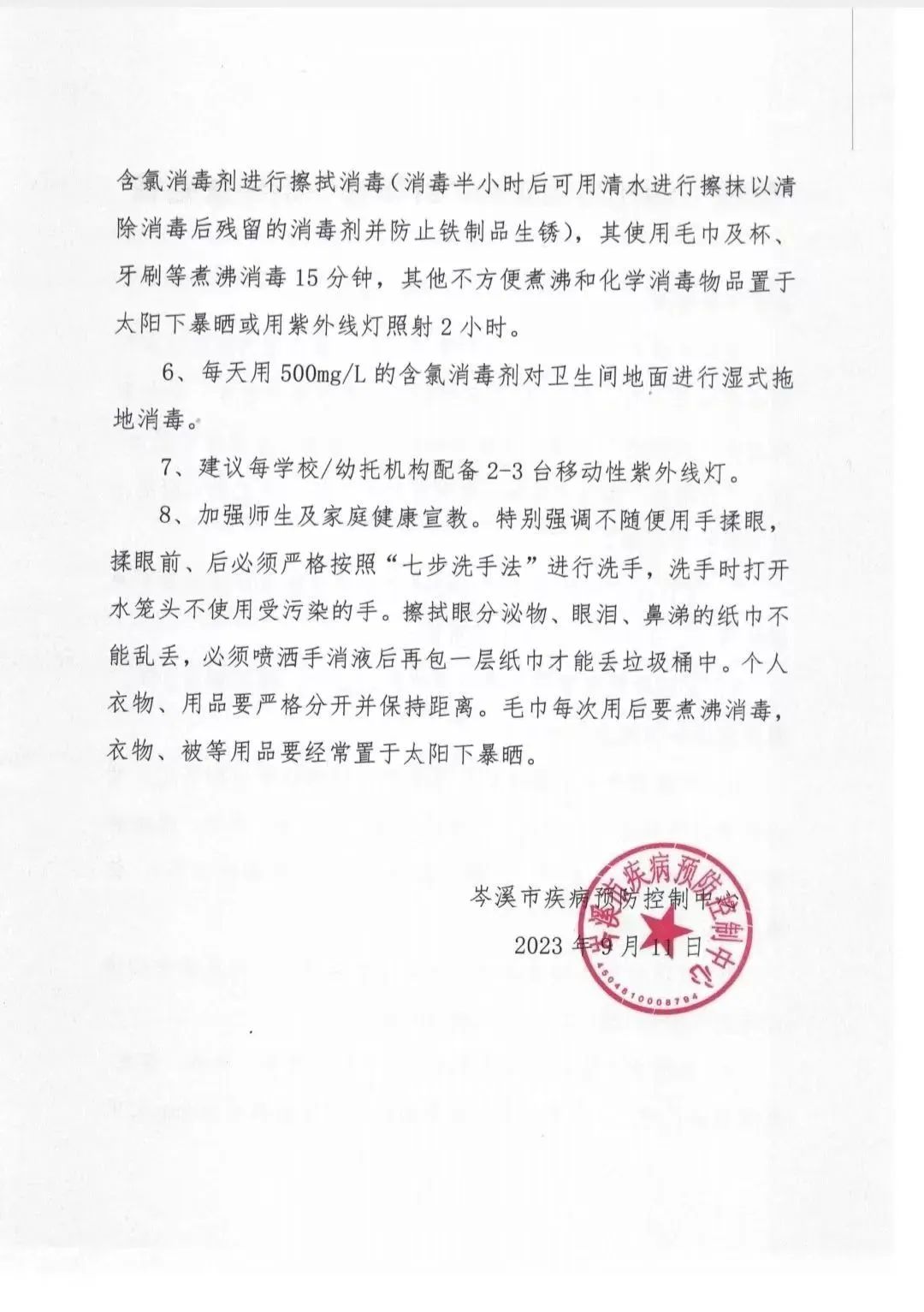 做好清潔:保持教室和宿舍良好通風(fēng),加強(qiáng)清掃和消毒工作,每日用含氯消毒劑擦拭消毒門把手、樓梯扶手、桌面等。特別是要做好校內(nèi)公共場(chǎng)所、公用物品、校車等物品的消毒工作。