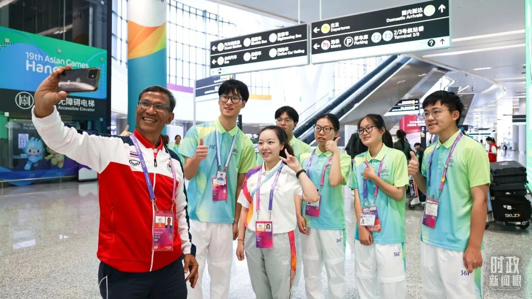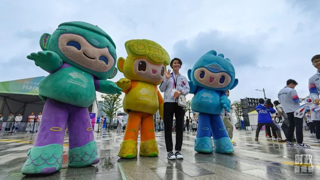 △亞運村為各代表團舉行歡迎儀式,隊員們紛紛與吉祥物“蓮蓮”、“琮琮”、“宸宸”合影。(總臺央視記者陳偉奎拍攝)