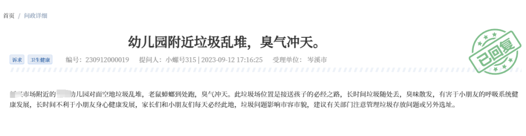 **市場附近的**幼兒園對面空地垃圾亂堆,老鼠蟑螂到處跑,臭氣沖天。此垃圾場位置是接送孩子的必經(jīng)之路,長時間垃圾隨處丟,臭味散發(fā),有害于小朋友的呼吸系統(tǒng)健康發(fā)展,長時間不利于小朋友身心健康發(fā)展,家長們和小朋友們每天必經(jīng)此地,垃圾問題影響市容市貌,建議有關(guān)部門注意管理垃圾存放問題或另外選址。