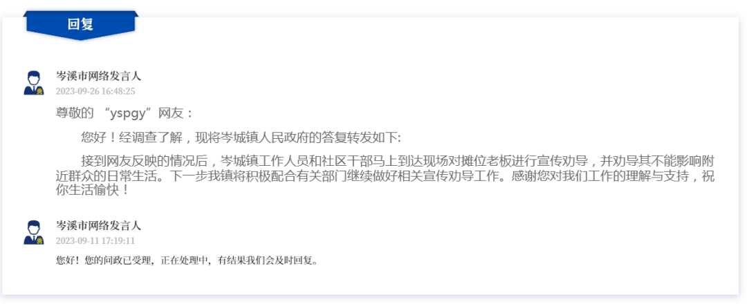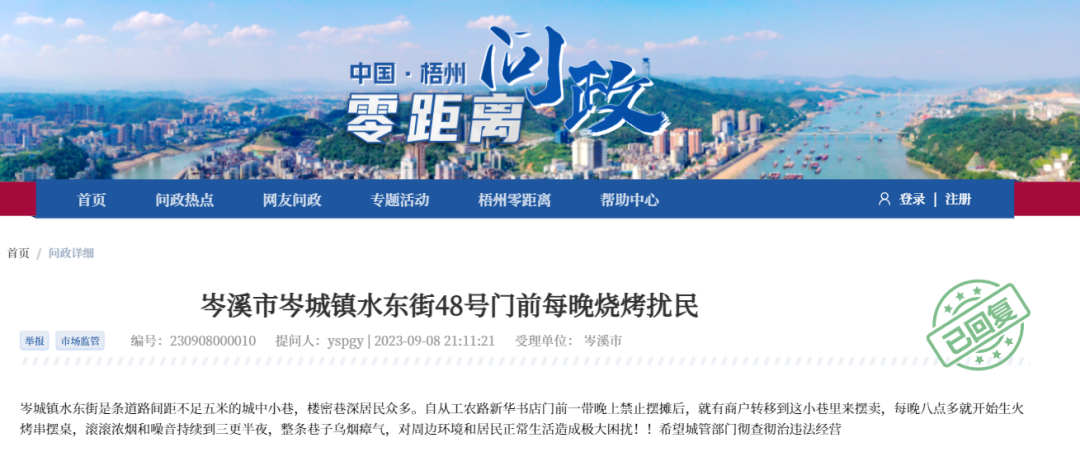 此前,已出現(xiàn)過多起夜宵、燒烤被投訴的情況。9月26日,回應(yīng)來了!據(jù)岑城鎮(zhèn)人民政府答復(fù)表示: 接到網(wǎng)友反映的情況后,岑城鎮(zhèn)工作人員和社區(qū)干部馬上到達(dá)現(xiàn)場,對攤位老板進(jìn)行宣傳勸導(dǎo),并勸導(dǎo)其不能影響附近群眾的日常生活。下一步,我鎮(zhèn)將積極配合有關(guān)部門繼續(xù)做好相關(guān)宣傳勸導(dǎo)工作。▲官方答復(fù)截圖