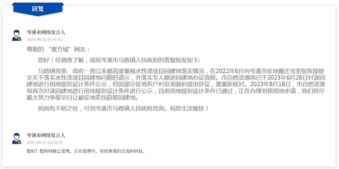 馬路鎮(zhèn)黨委、政府一直以來(lái)都高度重視水性漆項(xiàng)目回建地落實(shí)情況,在2022年6月向岑溪市征地搬遷攻堅(jiān)指揮部提交關(guān)于落實(shí)水性漆項(xiàng)目回建地問(wèn)題的請(qǐng)示,并落實(shí)專(zhuān)人跟進(jìn)回建地辦證流程。