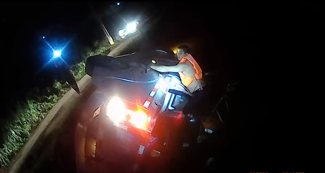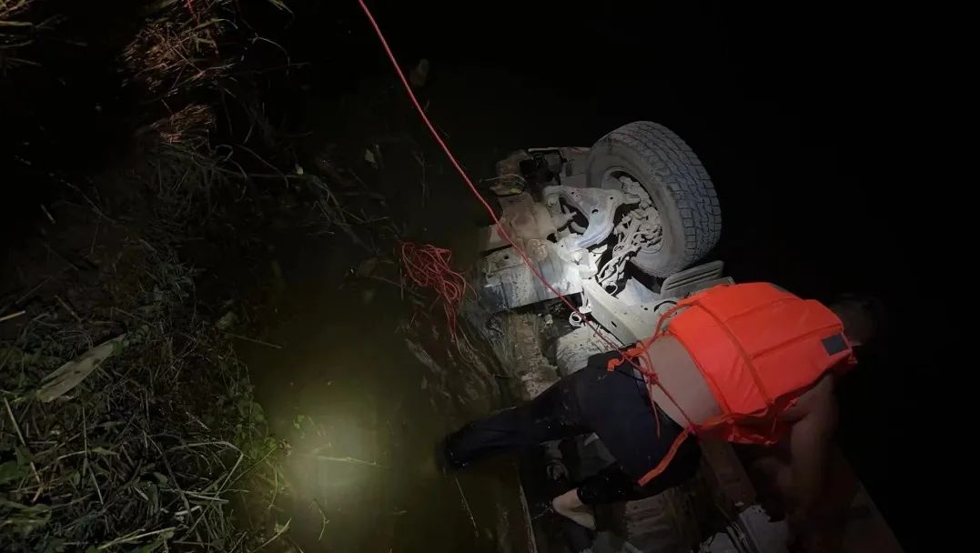 “我們是聽到了很大的聲響出門查看時就看到翻倒在水塘里的這輛皮卡車的,我們一直都沒看到有人從車里出來,我們想下去救人,可這處水塘的水很深,邊上雜草又高又多,而且是夜晚,我們嘗試了多次都無法實施救援,沒有工具根本下不去,大家只能想辦法拉住車不讓車那么快沉下去,不然車里的人就危險了”,現(xiàn)場的群眾對民警說道。